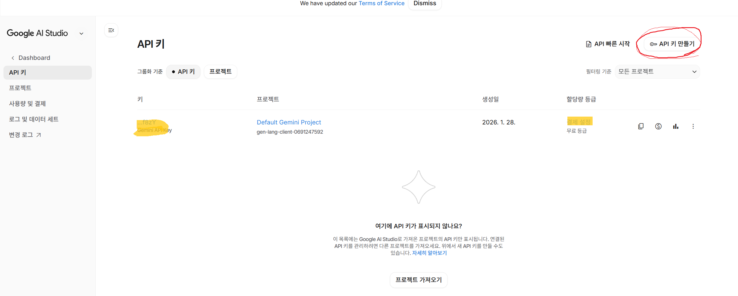 구글 제미나이 API 를 사용하기 위해서는 먼저 API 키를 발급 받아야 한다.