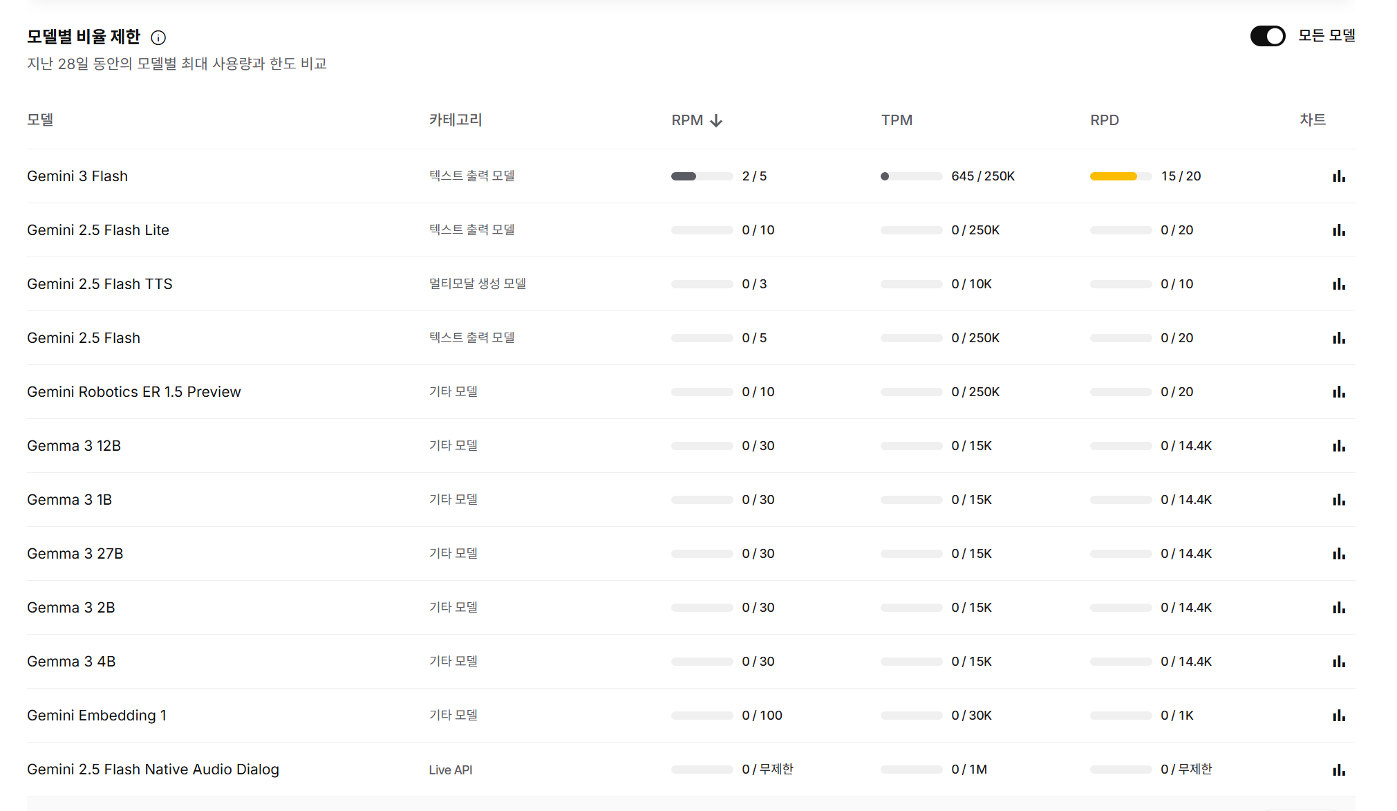 최신모델 제미나이 3 플레쉬는 20번 하루에 호출할수있고 그외 젬마 모델은 호출을 14400번 할수있는거같다.