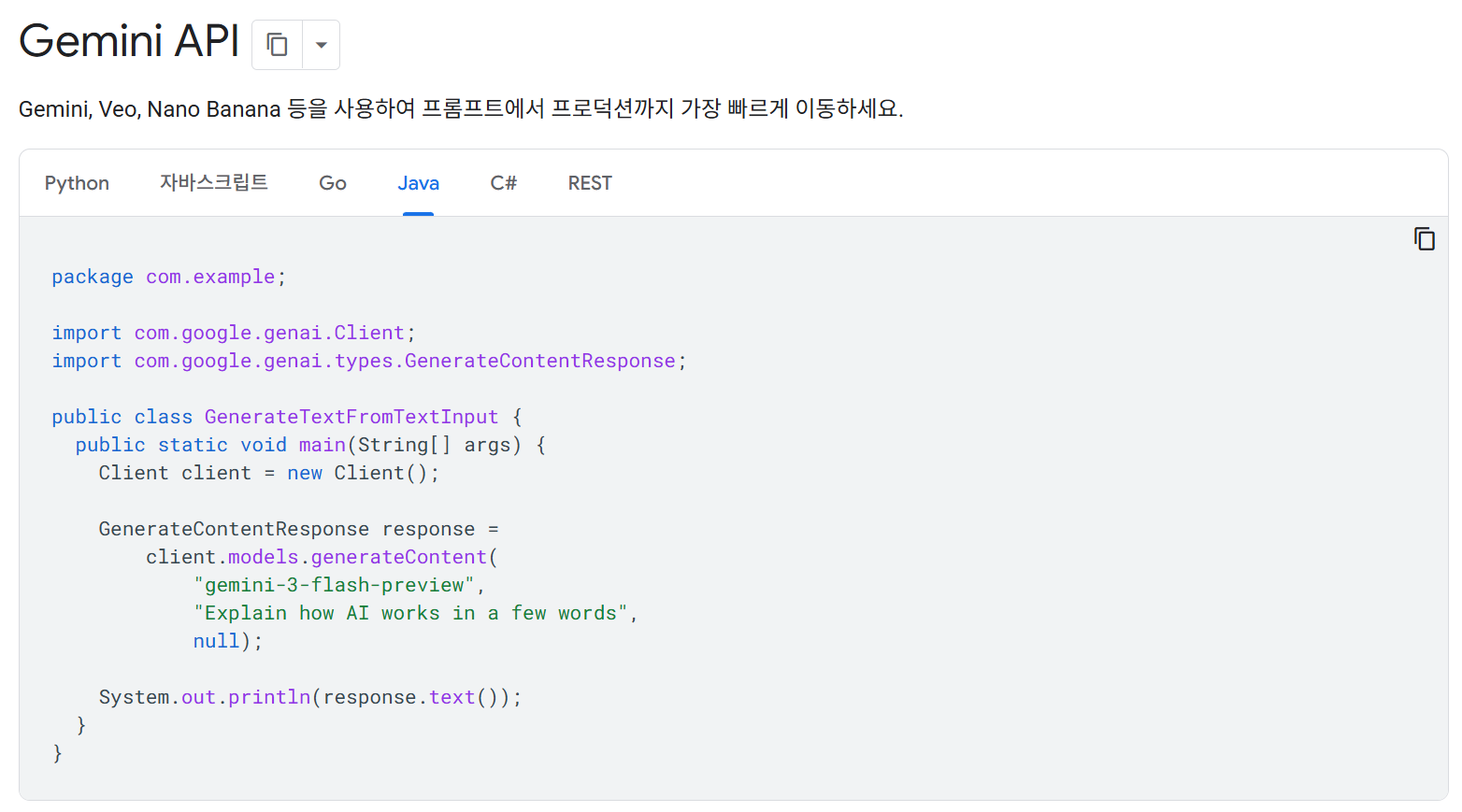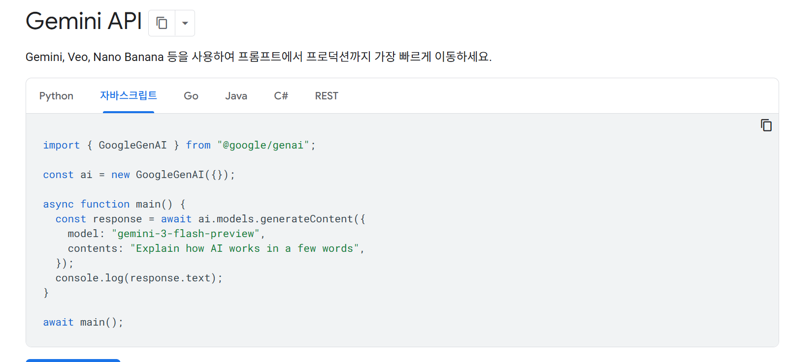 내가 쓸 제미나이 모델명을 써주고 프롬프트에 적을 말을 써써 보내주면 되는 간단한 호출방법이 마음에 든다.