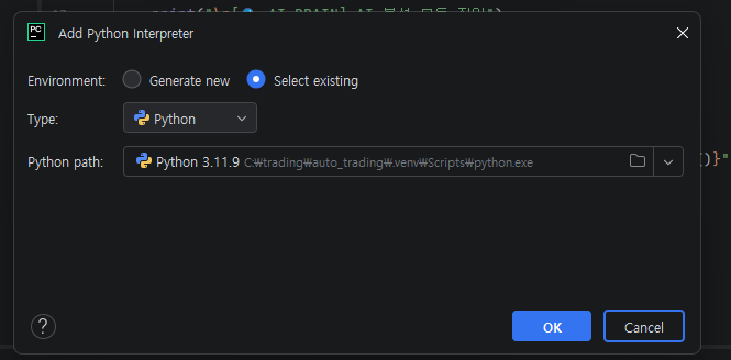 팝업에서 .venv 아래에 Script아래에 python.exe를 선택하고 OK버튼을 클릭한다.